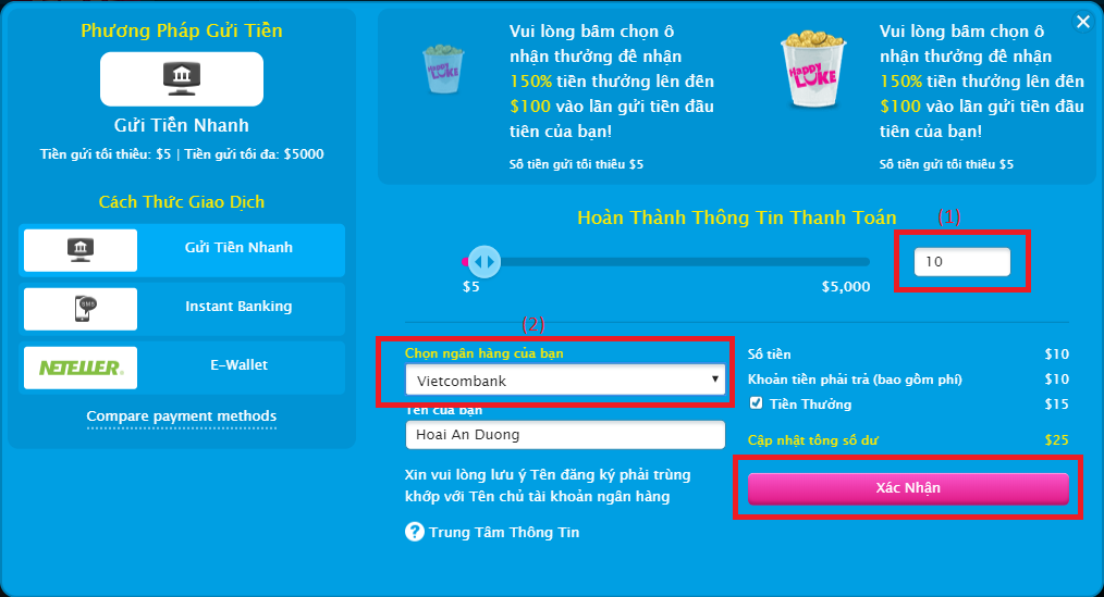 Hướng dẫn gửi tiền vào Happyluke qua hình ảnh