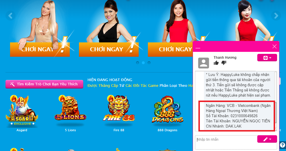 Anh em chát với hỗ trợ viên happyluke để lấy số tài khoản mới nhất nên chọn ngân hàng nào thì chuyển vào ngân hàng đó và đặc biệt phải xin số tài khoản mới nhất mỗi lần nạp tiền tránh tình trạng cập nhật lâu tiền vào tài khoản cá cược.(Ví dụ ACB thì xin số ACb và chuyển từ ACb của bạn vào ACB của happyluke nhé).
