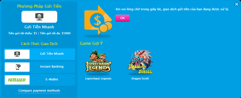 Nạp tiền hay gửi tiền vào nhà cái happyluke có rất nhiều cách bởi nhà cái này hỗ trợ nhiều phương thức thanh toán và thời gian tùy thuộc vào từng thể loại gửi tiền nhưng thời gian ước lượng là từ 3 đến 5 phút thôi.